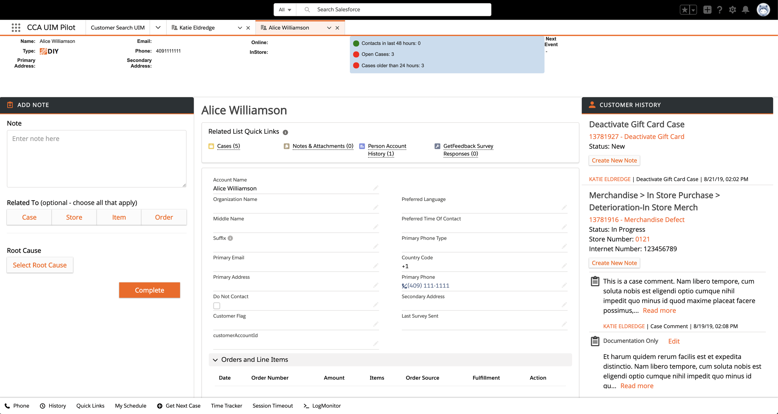 Screenshot from the pilot product that introduced the concept of interaction notes and a Customer History summary to Customer Care associates.